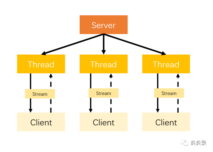 当多个客户端连接时,就会如下图所示,需要为每一个客户端建立一个线程