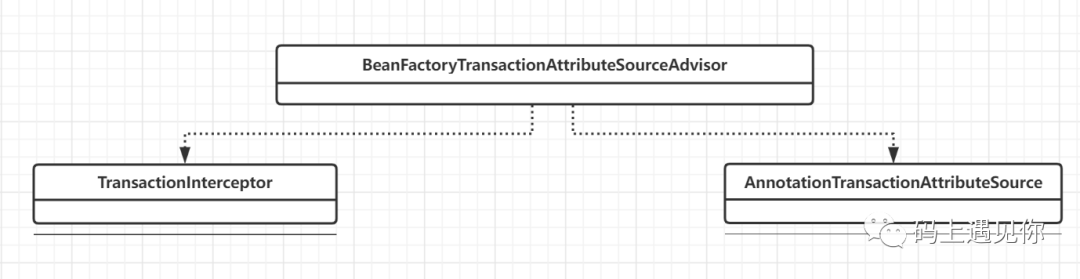 ,BeanFactoryTransactionAttributeSourceAdvisor作为Advisor的实现类,自然要遵从Advisor的处理方式,当代理被调用时会调用这个类的增强方法,也就是bean的Advice,又因为在解析事务定义标签时我们把Transactionlnterceptor