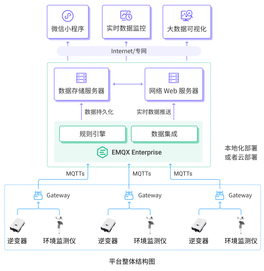 光伏电站数据接入:在光伏电站部署物联网数采网关,实现对光伏发电量、设备状态、环境等数据的采集。然后通过 4G、以太网、5G 等多种无线通讯方式,对接 MQTT 消息服务器 EMQX, 完成数据上云。