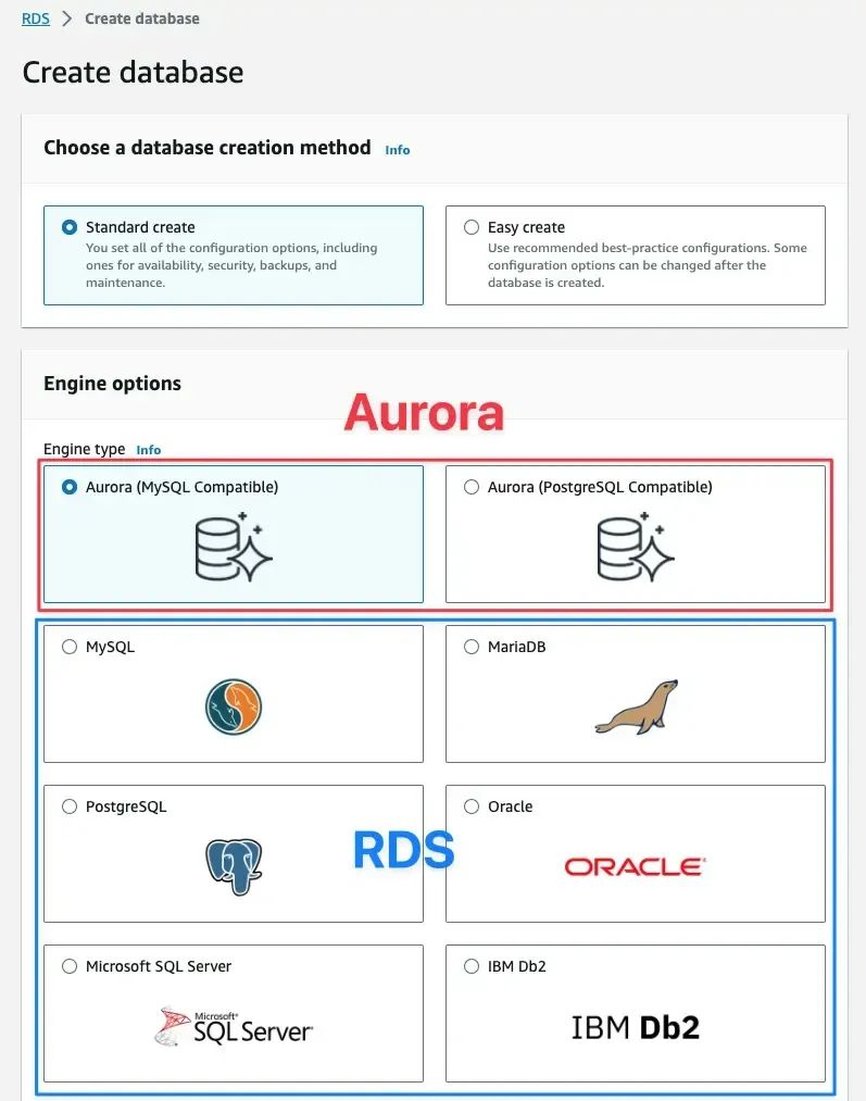 RDS 支持包括 MySQL、PostgreSQL、MariaDB、SQL Server、Oracle 和 Db2 在内的所有主流关系型数据库。而 Aurora 则支持 MySQL 和 PostgreSQL 这两种数据库。在选择数据库版本方面,使用 RDS 时,您可以自由选择各种上游的数据库版本。但如果使用 Aurora,您只能选择一些特定的版本,这些版本是基于 Aurora 特定版本的,对应的也是某几个上游版本。RDS 就是把主流的数据库搬到云平台上。相对而言,Aurora 则是一种「云原生」数据库服务。之所以说它是「云原生」的,是因为 Aurora 充分利用了云环境的特性,例如通过将计算和存储分离,以及利用 Amazon S3 (https://aws.amazon.com/s3/) 进行数据的持久化保存。这种创新的设计极大地提升了数据库的性能、高可用性和扩展能力。Aurora 和 RDS 作为云数据库,都存在一些共同的限制:- 您只能使用半超级用户 (https://docs.aws.amazon.com/AmazonRDS/latest/UserGuide/UsingWithRDS.MasterAccounts.html)。- 您无法访问数据库服务器的文件系统。对于 MySQL 来说,这意味着您只能使用 LOAD DATA LOCAL 从本地文件系统导入数据,而不能使用 LOAD DATA 从服务器文件系统导入数据。虽然 Aurora 是一项专有技术,但它与普通 MySQL PostgreSQL 的主要区别在于存储引擎层。另一方面,决定大多数面向用户行为的服务器层几乎完全相同。例如,MySQL 的 Aurora 仅支持 InnoDB,而 RDS 支持 MyISAM 等旧引擎(不过,如果您启动一个新项目,无论如何都不会使用 MyISAM 引擎)。话虽如此,Aurora 的代码库与标准 MySQL Postgres 相比,与 RDS 的差异更大,因此您应该预期 AWS 团队在引入最新的上游更新方面会有更多的延迟。例如,Aurora PostgreSQL 比 RDS 晚了两个月才添加了当红的 pgvector 扩展。根据官方网站 (https://aws.amazon.com/rds/aurora/features/),Aurora 的吞吐量是 MySQL 的 5 倍,是 PostgreSQL 的 3 倍。
