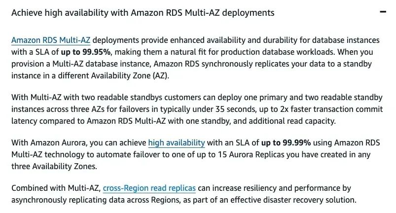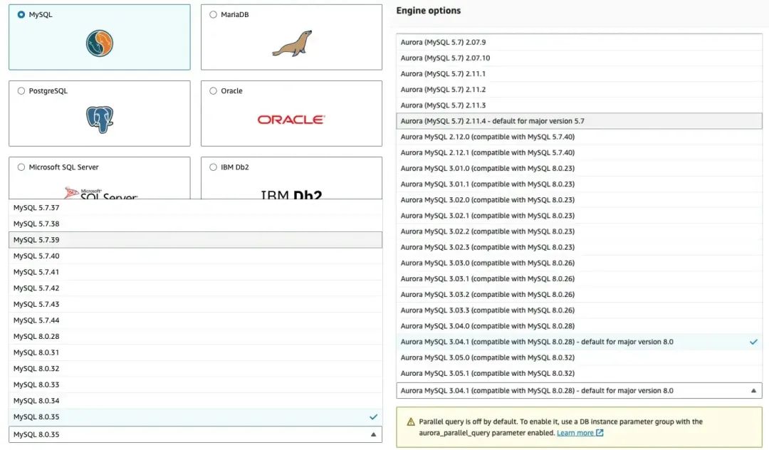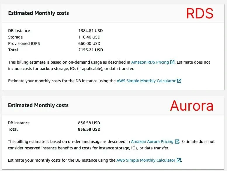 这个测试甚至 (https://dev.to/aws-heroes/amazon-aurora-is-now-60-times-faster-than-rds-for-mysql-really-3c0e) 表明,Aurora 的性能是 RDS 的 60 倍。Aurora 在写入性能上表现更佳,主要原因是它在处理数据时只发送重做日志到远端存储服务,避免了其他在事务提交过程中可能发生的写入操作,例如广为人知的 doule-write buffer 问题。得益于其基于日志的架构,Aurora 在读取操作的可扩展性方面也更出色,能够支持多达 15 个读副本。相比之下,RDS 最多只能支持 5 个读副本,因为传统的流式复制技术会对主数据库造成较大的性能影响。此外,在写入密集的负载条件下,Aurora 的复制延迟也大大降低了。RDS 使用的是 EBS 存储,其磁盘性能会根据不同的存储类型 (https://docs.aws.amazon.com//AmazonRDS/latest/UserGuide/CHAP_Storage.html) 而有所差异。总体来说,Aurora 在性能上显著优于 RDS。但是,您仍然需要针对自己的实际工作负载进行具体的性能测试。RDS 的弹性相对有限,如果您选择了 gp2 SSD 存储,它能提供一定的性能突增 (https://docs.aws.amazon.com//AmazonRDS/latest/UserGuide/CHAP_Storage.html),但基本上就这些了。标准 Aurora 可以快速提供读副本,但除此之外,它不提供开箱即用的弹性。Aurora Serverless 版本,特别是 Serverless v2 (https://docs.aws.amazon.com/AmazonRDS/latest/AuroraUserGuide/aurora-serverless-v2.html),则在弹性伸缩方面做得非常出色,能够根据需要灵活调整计算资源,这对于电商等需要应对不同时间段不同负载的场景非常适用。RDS 提供多可用区(multi-AZ)高可用(HA)设置,SLA 高达 99.95%,而 Aurora 则提供高达 99.99% 的 SLA。由于其基于日志的架构,Aurora 可以更快地 failover。特别是在写入操作较多的情况下,由于复制延迟的问题,RDS 在故障切换上可能会遇到更多的困难。Aurora 还拥有全球数据库功能 (Aurora Global Database) (https://docs.aws.amazon.com/AmazonRDS/latest/AuroraUserGuide/aurora-global-database.html),可以实现低延迟的全球读取和跨 AWS 区域的灾难恢复。如果您按照 AWS 向导选择生产模板(8c64g r6g.2xlarge + multi-AZ HA),您会发现 Aurora 的价格比 RDS 便宜得多。好得令人难以置信。
