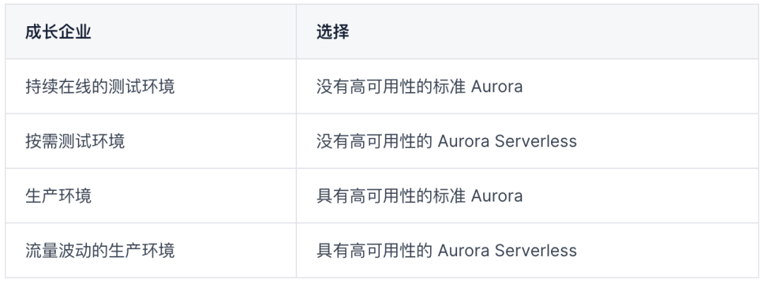 然而,需要注意的是 Aurora 还会对数据的 I/O 操作收费,而这通常不包含在初步的价格预估中。这一点在很多客户收到高额 AWS 账单时令他们感到意外。这种不确定的成本曾是团队最初采用 Aurora 时的一大顾虑。到了 2023 年,Aurora 通过推出 I/O-优化版来将 I/O 成本纳入存储费用,解决了这一问题。除此之外,只有 RDS 提供免费使用计划和较低配置的数据库实例,起步配置为 2c1g t3.micro。而标准的 Aurora 最低配置是 2c16g r5.large,能够支持 burst 的类别则从 2c4g t3.medium 开始。Aurora Serverless 允许设置最低 0.5 ACU(应用计算单元),其中 1 ACU 提供 2 GiB 内存及相应的计算和网络资源。总之,您应该使用 AWS 定价计算器 (https://calculator.aws/) 进行成本估算,使用如 Vantage (https://www.vantage.sh/) 这样的专业工具来监控数据库成本也是一个不错的选择。在能力方面,AWS Aurora 几乎在每个方面都胜过 RDS。由于 Aurora 是 AWS 与其他云服务商区别开来的关键因素,AWS 也在 Aurora 上投入了更多资源。尽管 Aurora 大多数情况下与 MySQL PostgreSQL 兼容,但它通过提供无与伦比的性价比,创造了另一种 evndor -lock-in。对于初创企业或小型企业,Aurora 的价格仍然较高,而 RDS 是一个更经济的解决方案:对于处于成长阶段的企业来说,Aurora 更适合,Aurora Serverless 为成本优化提供了额外的灵活性: