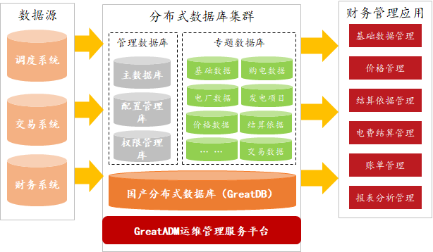 电费结算与支付系统数据源自业务场景的调度系统、交易系统、财务系统等多个系统,需要将处理后的数据存储到GreatDB分布式数据库集群中。整个集群分为管理数据库和专题数据库两部分:管理数据库包括主数据库、配置管理库、权限管理库,主要用于对整个数据库集群进行统一管理;专题数据库包括基础数据、电厂数据、价格数据、结算依据等业务数据库。整个数据库集群对外提供数据存储和抽取接口,对基础数据管理、价格管理、电费结算管理等财务管理应用系统提供数据。