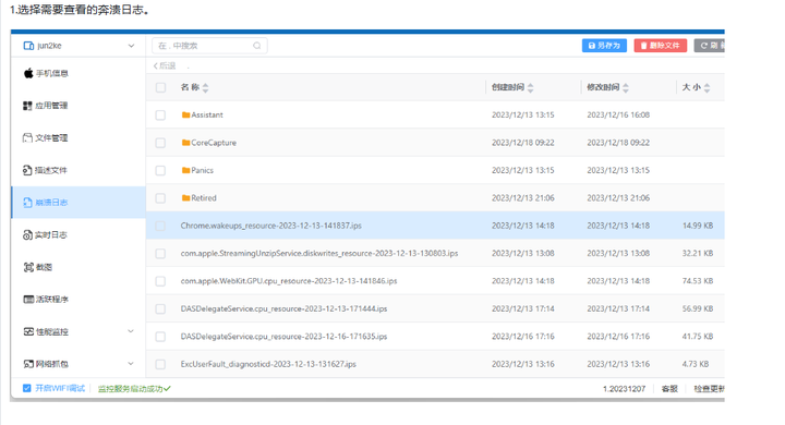 克魔助手还提供了奔溃日志分析查看模块,可以方便地导出和查看iOS设备上的奔溃日志,并对其进行符号化、格式化和分析。操作如下: