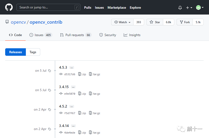 opencv_contrib的下载链接为https://github.com/opencv/opencv_contrib/releases。下载时需要注意:opencv_contrib和OpenCV安装包的版本要相同。