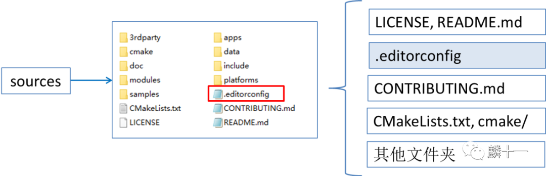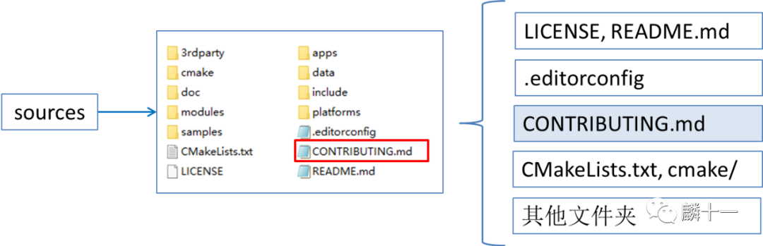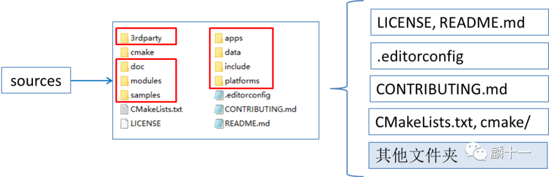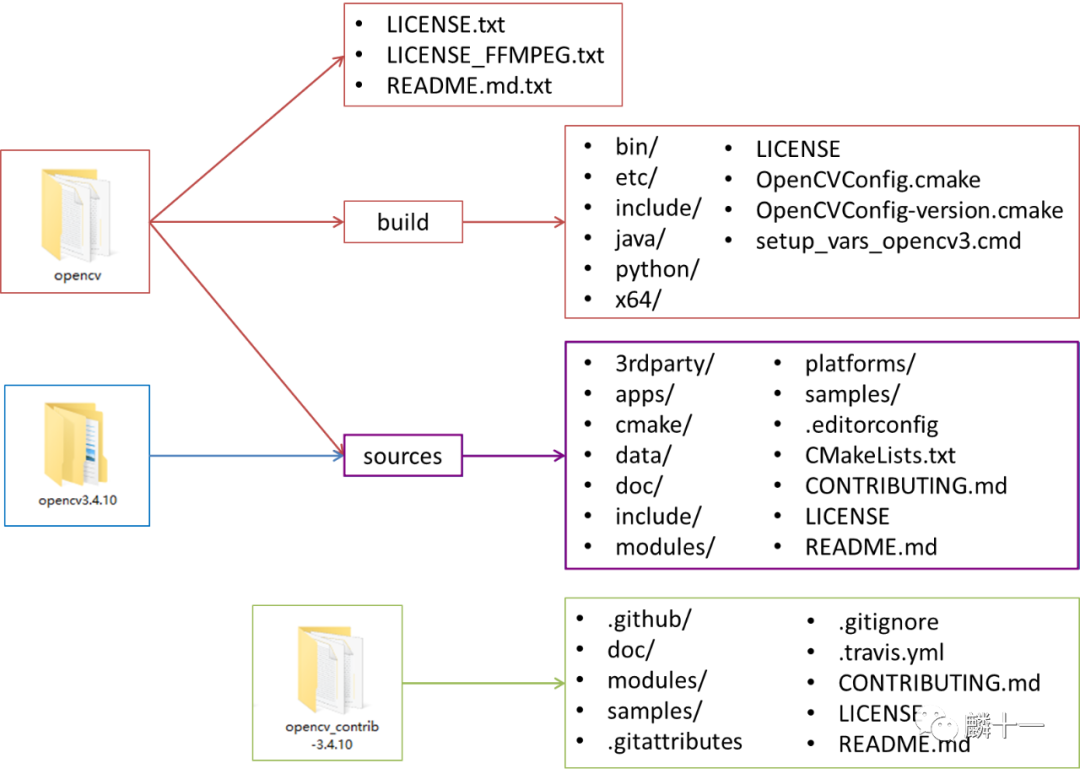 拿OpenCV3.4.10举例,三个文件夹的关系和内容结构如下图所示。绿色的是opencv_contrib文件夹,sources同时存在于Windows安装包和源代码压缩包中