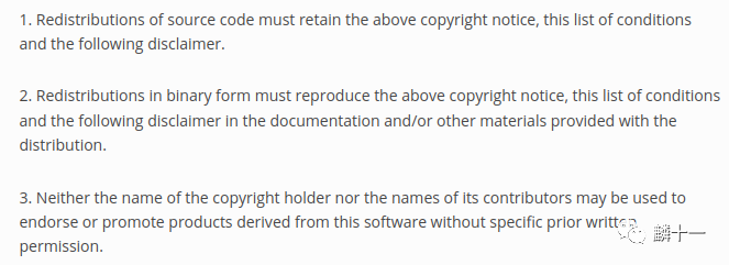 简单理解:1.如果以源代码的形式进行产品再发布,需要保留BSD 3-Clause License;2.如果以二进制的形式(如库文件)进行产品再发布,需要在文档或其他材料中提供BSD 3-Clause License;3.在未获得书面许可的情况下,不能使用版权持有者(Copyright Holder)或项目贡献者(Contributors)的名字进行宣传或生产活动。