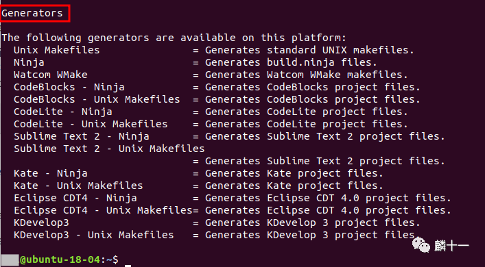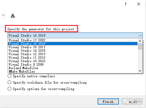 我在Windows系统上下载了cmake-gui,也就是CMake的图形用户界面工具,在这里也能看到该平台下的生成器列表: