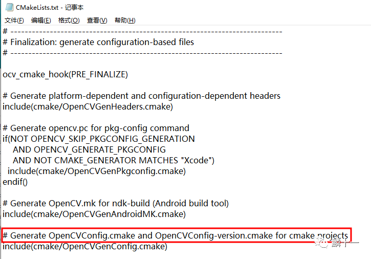 上图是sources文件夹根目录下的CMakeLists.txt(部分内容),上图是一段生成配置文件(Configuration-based Files)的代码。CMake先根据平台和项目配置生成了头文件,之后生成了各种配置文件:为类Unix系统(pkg-config command)生成opencv.pc,为安卓系统生成OpenCV.mk,为整个项目(不是仅在Windows系统下)生成OpenCVConfig.cmake和OpenCVConfig-version.cmake。