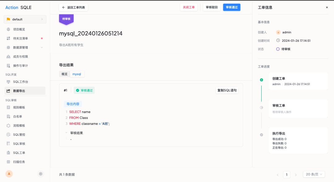 2. 审核人进入工单详情,查看导出详情后,可以驳回或通过导出申请。
