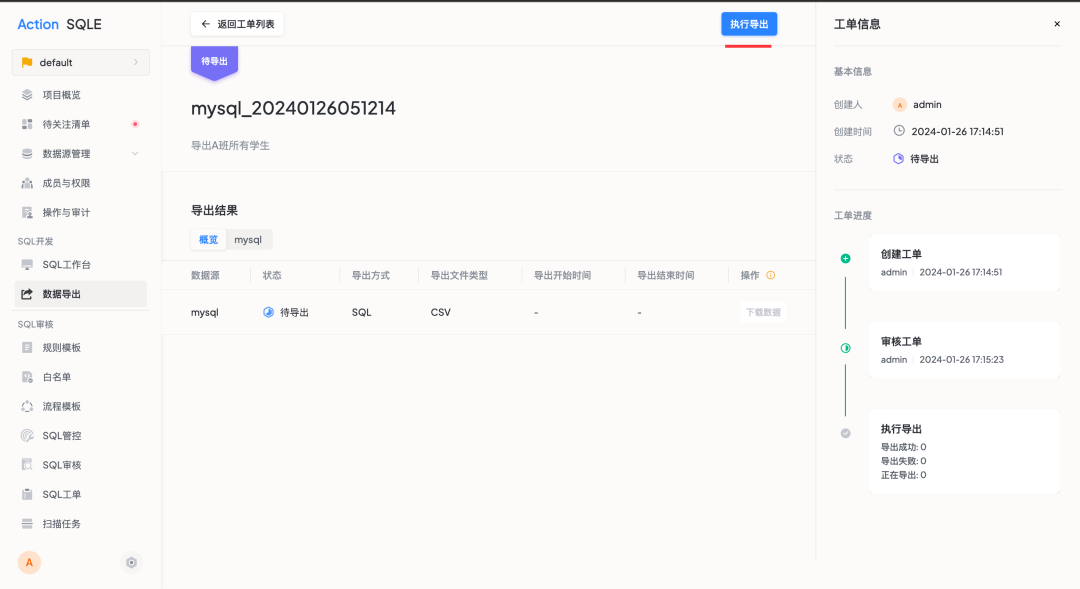 3. 审核通过后,创建人可以进入工单详情,执行数据导出后获取所需的数据。