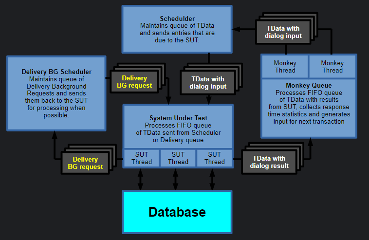 BenchmarkSQL 是用 Java 实现的,使用 JDBC 对 SQL 数据库进行压力测试。整个体系结构是一系列数据结构、队列和线程组,用于处理模拟终端、用户和应用程序线程。它的体系结构允许 BenchmarkSQL 驱动最多的 TPC-C 配置数千个仓库(称为缩放因子),而不会压倒测试驱动程序本身的作业调度器。