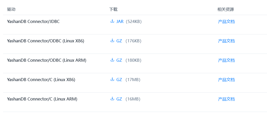 目前 YashanDB 官方提供 JDBC, ODBC, C 三种驱动的下载,下载页面是:https://download.yashandb.com/download
