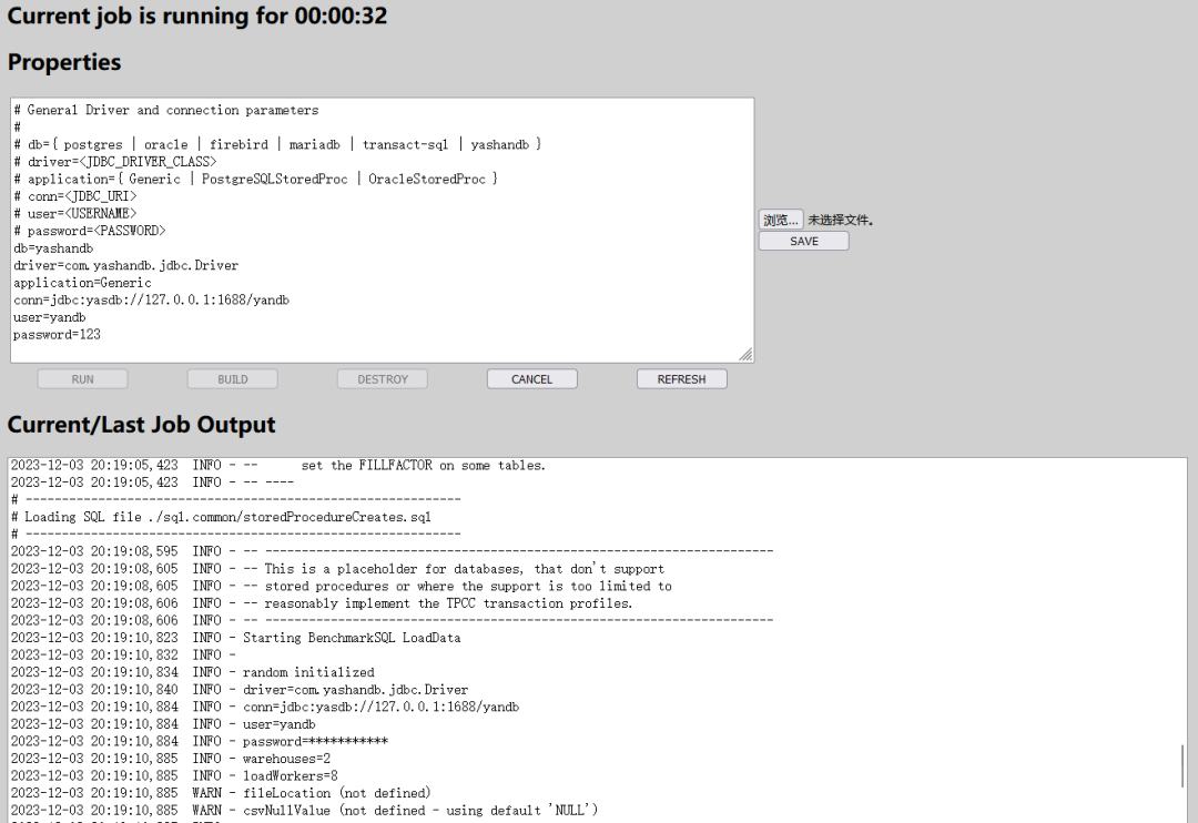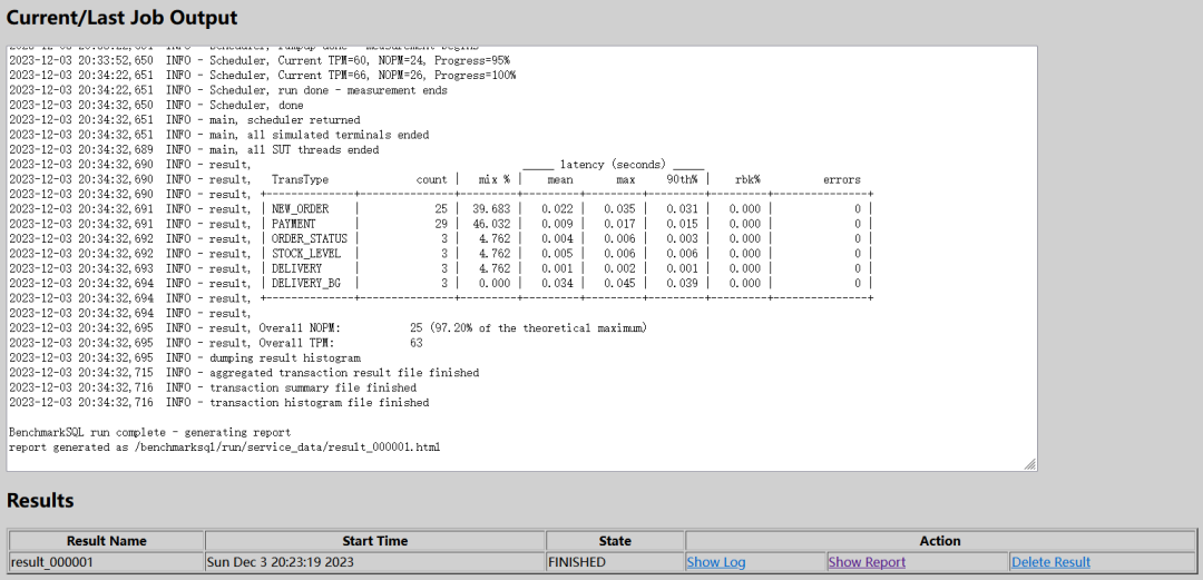 - Current/Last Job Output# ------------------------------------------------------------# Loading SQL file ./sql.yashandb/tableCreates.sql# ------------------------------------------------------------2023-12-03 20:19:02,472 INFO - create table bmsql_config (cfg_name varchar2(30) primary key,cfg_value varchar2(50));...# ------------------------------------------------------------# Loading SQL file ./sql.common/storedProcedureCreates.sql# ------------------------------------------------------------2023-12-03 20:19:08,595 INFO - -- ----------------------------------------------------------------------2023-12-03 20:19:08,605 INFO - -- This is a placeholder for databases, that don't support2023-12-03 20:19:08,605 INFO - -- stored procedures or where the support is too limited to2023-12-03 20:19:08,606 INFO - -- reasonably implement the TPCC transaction profiles.2023-12-03 20:19:08,606 INFO - -- ----------------------------------------------------------------------2023-12-03 20:19:10,823 INFO - Starting BenchmarkSQL LoadData2023-12-03 20:19:10,832 INFO -2023-12-03 20:19:10,834 INFO - random initialized2023-12-03 20:19:10,840 INFO - driver=com.yashandb.jdbc.Driver2023-12-03 20:19:10,884 INFO - conn=jdbc:yasdb://127.0.0.1:1688/yandb2023-12-03 20:19:10,884 INFO - user=yandb2023-12-03 20:19:10,884 INFO - password=***********...# ------------------------------------------------------------# Loading SQL file ./sql.common/indexCreates.sql# ------------------------------------------------------------2023-12-03 20:20:24,343 INFO - alter table bmsql_warehouse add constraint bmsql_warehouse_pkeyprimary key (w_id);...# ------------------------------------------------------------# Loading SQL file ./sql.common/foreignKeys.sql# ------------------------------------------------------------2023-12-03 20:20:29,379 INFO - alter table bmsql_district add constraint d_warehouse_fkeyforeign key (d_w_id)references bmsql_warehouse (w_id);...# ------------------------------------------------------------# Loading SQL file ./sql.common/buildFinish.sql# ------------------------------------------------------------2023-12-03 20:21:07,512 INFO - -- ----2023-12-03 20:21:07,521 INFO - -- Extra commands to run after the tables are created, loaded,2023-12-03 20:21:07,521 INFO - -- indexes built and extra's created.2023-12-03 20:21:07,522 INFO - -- ----