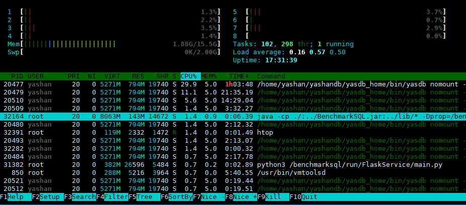 测试过程中,YashanDB 和 BenchmarkSQL 的运行载荷都正常。