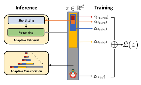 MRL通过标准的经验风险最小化来优化每个嵌套维度的多类分类损失。 具体而言,针对每个,MRL使用一个独立的线性分类器,其中是标签的数量。损失函数通过加权求和来聚合每个嵌套维度的损失,权重由参数控制。
