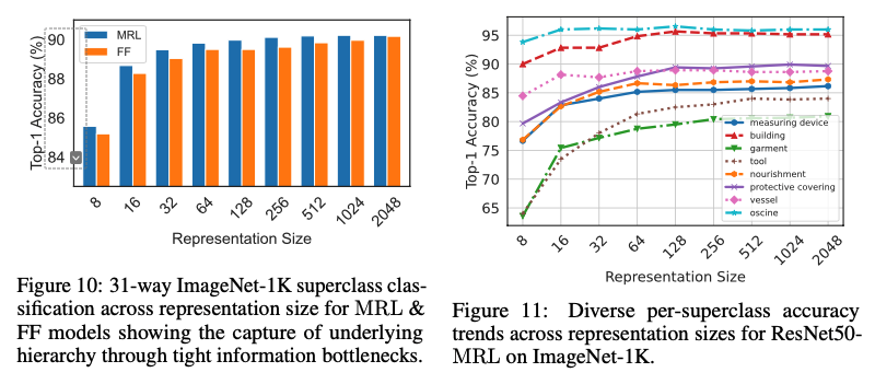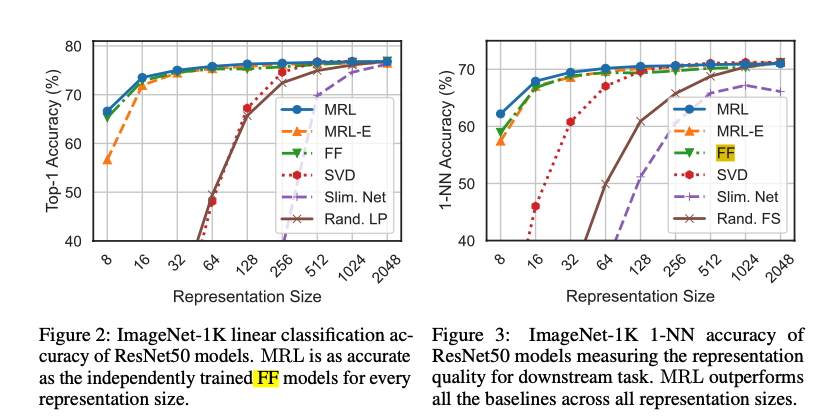 首先将MRL应用于各种表示学习设置,通过线性分类/探测(LP)和1-最近邻(1-NN)准确度来评估学习到的表示的质量和容量: