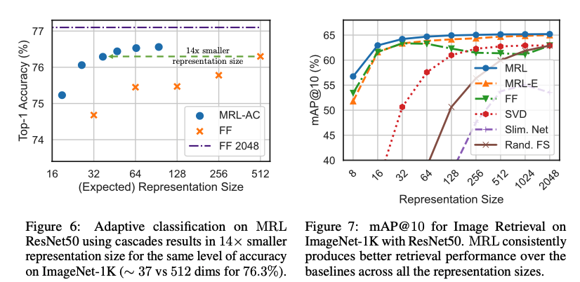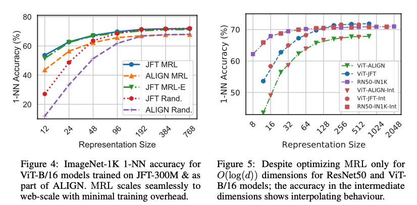 对于ImageNet-1K分类,嵌入大小可以减少多达14倍,而准确度保持不变; 对于ImageNet-1K和4K的大规模检索,速度提升多达14倍; 对于长尾少样本分类,准确度提高多达2%,同时保持与原始表示一样的稳健性。 MRL可以无缝扩展到Web规模的数据集,如视觉(ViT,ResNet),视觉+语言(ALIGN)和语言(BERT)等。