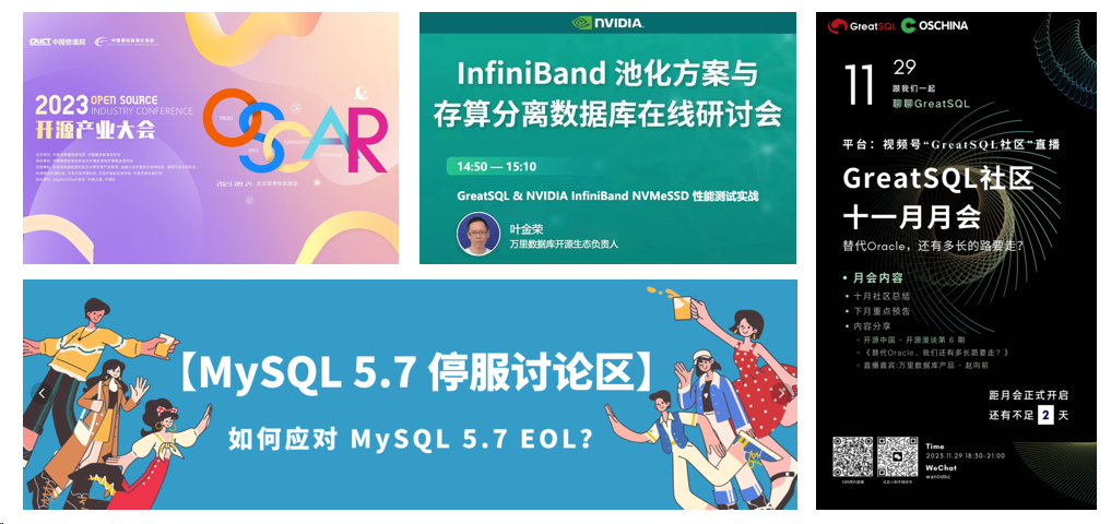 2023 是互动的一年。在这一年中,社区组织了 10 余个线上论坛互动活动,创建了社区茶话会、社区月会;自建、参加了 20 余场线上直播分享、线下技术沙龙,与墨天轮、3306Π、InfoQ、开源中国、开放原子开源基金会、中国信通院达成了深度合作。