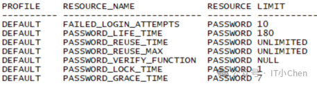 set line 300col profile for a10col resource_name for a25col limit for a20select * from dba_profiles where profile='DEFAULT' and resource_type='PASSWORD';