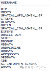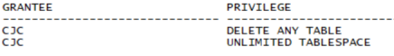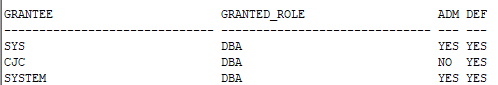 SQL> select USERNAME,DEFAULT_TABLESPACE,PROFILE from dba_users where username='CJC';USERNAME DEFAULT_TABLESPACE PROFILE------------------------------ ------------------------------ -----------------------------------CJC CJC CJC_PROFILE