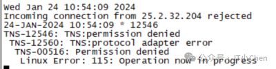 [oracle@cjc-db-01 trace]$ vi cli_20037.trc......(4158699328) [27-JAN-2024 14:05:20:555] nspsend: packet dump(4158699328) [27-JAN-2024 14:05:20:555] nspsend: 00 53 00 00 06 00 00 00 |.S......|(4158699328) [27-JAN-2024 14:05:20:555] nspsend: 00 00 8F 2D 1B 3F 9C 78 |...-.?.x|(4158699328) [27-JAN-2024 14:05:20:555] nspsend: 8C 85 B9 DD 2E 33 14 42 |.....3.B|(4158699328) [27-JAN-2024 14:05:20:555] nspsend: 2F 0C 3D 78 BA 7F F6 22 |/.=x..."|(4158699328) [27-JAN-2024 14:05:20:555] nspsend: 08 94 97 F4 21 DE 1B C3 |....!...|(4158699328) [27-JAN-2024 14:05:20:555] nspsend: D2 2B EF 21 F8 43 DA B3 |.+.!.C..|(4158699328) [27-JAN-2024 14:05:20:555] nspsend: 52 08 EC F0 0D F2 63 84 |R.....c.|(4158699328) [27-JAN-2024 14:05:20:555] nspsend: 90 15 39 70 D5 6C D8 19 |..9p.l..|(4158699328) [27-JAN-2024 14:05:20:555] nspsend: A2 F3 A1 BB A7 66 69 50 |.....fiP|(4158699328) [27-JAN-2024 14:05:20:555] nspsend: 27 92 9C 0B 92 74 31 43 |'....t1C|(4158699328) [27-JAN-2024 14:05:20:555] nspsend: A5 00 00 |... |(4158699328) [27-JAN-2024 14:05:20:555] nspsend: 83 bytes to transport(4158699328) [27-JAN-2024 14:05:20:555] nspsend: normal exit....