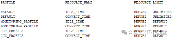 1.FAILED_LOGIN_ATTEMPTS 5,密码连续输入错误5次,用户自动锁定;2.PASSWORD_LIFE_TIME 60,密码过期时间60天;3.PASSWORD_REUSE_TIME 60,口令重用时间间隔60天;4.PASSWORD_REUSE_MAX 5,口令被重用之前密码改变的次数;5.PASSWORD_VERIFY_FUNCTION 口令复杂度审计函数verify_function,要求密码必须包含至少一个数字,一个字符和一个标点符号,长度至少为4;;6.PASSWORD_LOCK_TIME 1/24,登录超过有效次数锁定时间,1小时;7.PASSWORD_GRACE_TIME 10,用户口令使用时间超过生命周期(PASSWORD_LIFE_TIME)后,可以延续使用的天数,1小时;