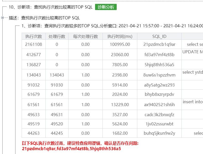 “指标查找智能诊断路径”工具也针对这个问题推荐了一些诊断工具,其中包含共享池分析,也有一些TOP SQL的诊断工具。因为刚才我们已经看到了上一个工具的分析结果,于是我们先不做共享池分析了,因为共享池的问题很可能是TOP SQL引起的。于是先看看执行次数较高的SQL: