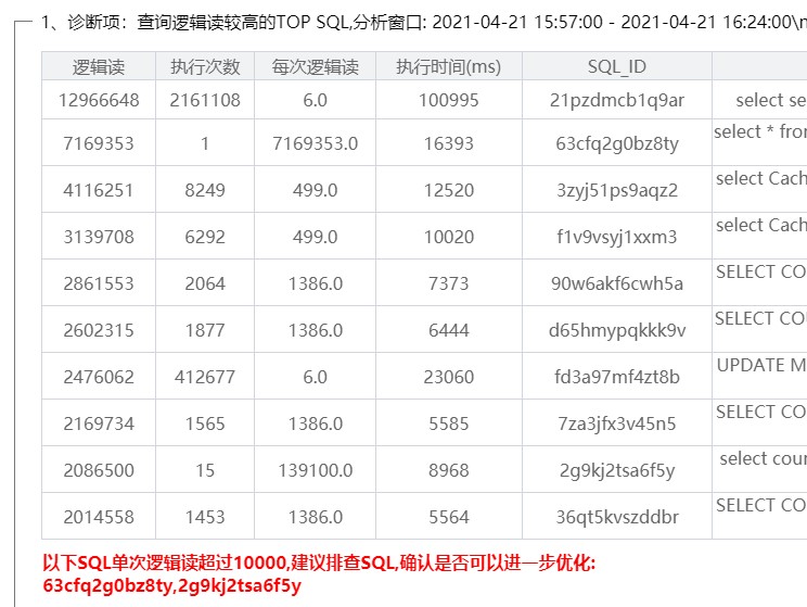 排在前三位的SQL居然在半小时内执行了近300万次,而且这些次SQL都没有返回任何数据。这种业务逻辑肯定是有问题的。再来看看逻辑读较高的TOP SQL。