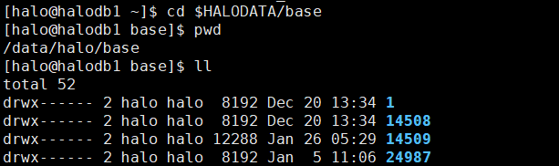 上图所述表空间所存放的物理位置放置在$HALODATA/base目录下,该目录下的存放很以OID命名的文件夹,就是该集簇下数据库存放的物理位置。接下来我们看下具体例子: