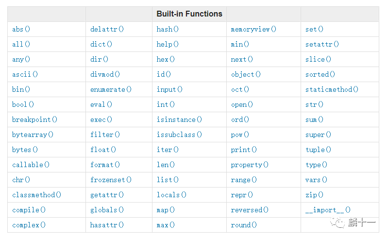 Python中的内置函数(Built-in Functions)涵盖了计算、转换、输出等内容,不同版本Python的内置函数个数不同,具体内容在官网上可以找到,网址:https://docs.python.org/3/library/functions.html。下图是Python3.7的内置函数列表: