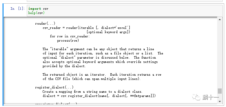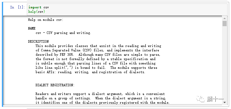 在之前的文章中我们用到的很多函数都属于内置函数,例如print(),bin(),bytes(),chr()等等。在这里推荐一个非常好用的内置函数:help(),使用这个函数可以查看相应Python库的基本信息和具体函数的用法,拿csv库来举例,help(csv)输出的内容如下: