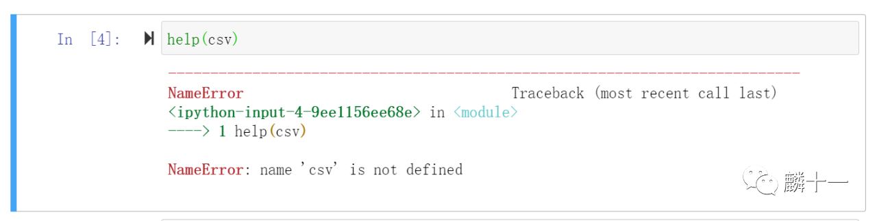 内置异常(Built-in Exceptions)一般都是在函数返回错误时被引发,返回错误也就是我们常说的“报错”。被引发的异常其实有很多种,常见的如OSError(操作系统错误),ImportError(导入模块/对象失败),NameError(未声明/初始化对象)等。举个例子,如果我们刚刚在使用help(csv)时没有先用语句import csv载入模块的话,就会出现如下异常: