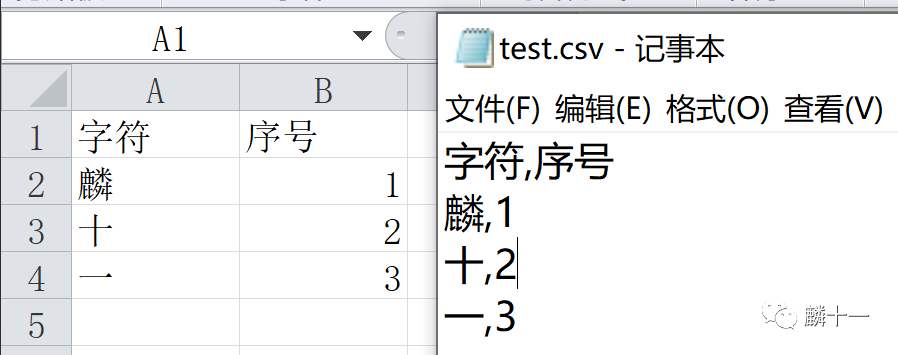 csv库可以使用csv.reader()和csv.DictReader()函数读取CSV文件,pandas库可以使用pandas.read_csv()函数读取文件。先新建一个test.csv文件,里面包含了“麟十一”三个字符和相应的序号。创建完成后,使用CSV和TXT格式分别打开文件,可以发现在记事本中字符串的分隔符是英文逗号: