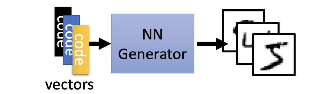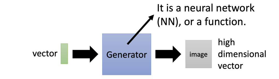 在 GAN 中我们想要训练的东西是生成器(Generator)。生成器其实是一个神经网络,它的输入是一个向量(Vector),输出则是一个更高维的向量,如下图所示: