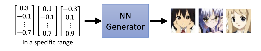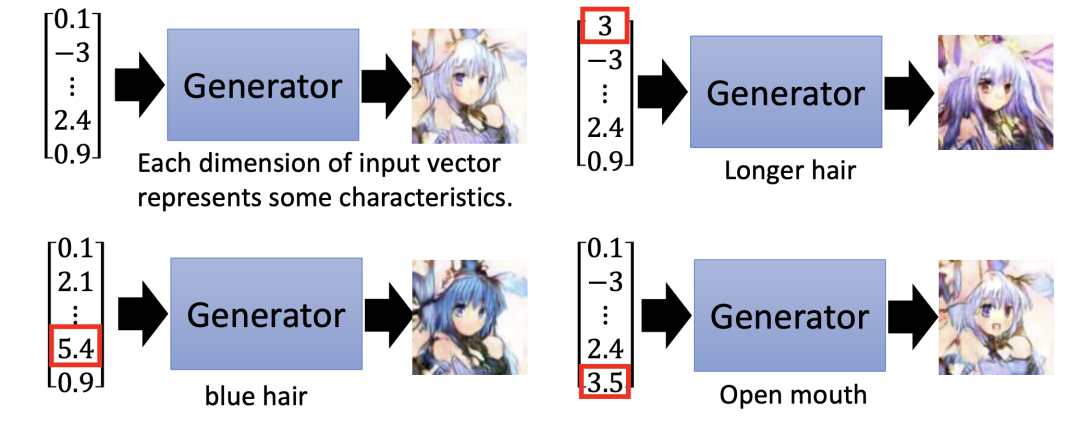 对于输入向量而言,它的每一个维度可以代表图片某种特征,当我们改变这个维度时,这个特征就会发生改变。比如,我们假设向量的第一个维度代表头发,当该维度值改变后,动漫人物头发的颜色就会变化: