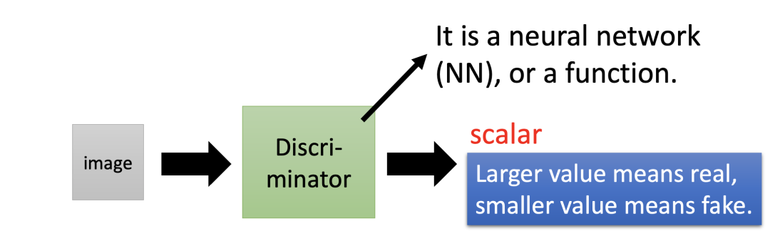 在 GAN 中还会训练出一个判别器(Discriminator)。判别器也是一个神经网络,它的输入是一个高维向量(如一张图片),输出是一个数值。输出值用于判断输入图片的质量,输出值越高表示输入图片越真实。