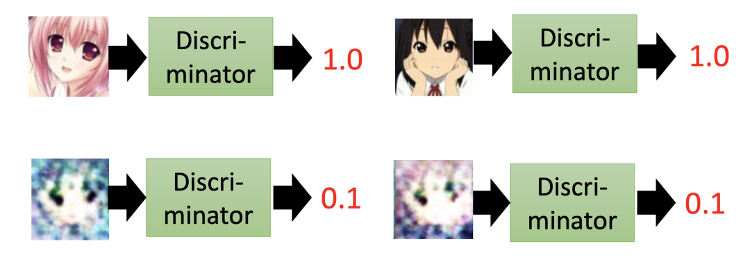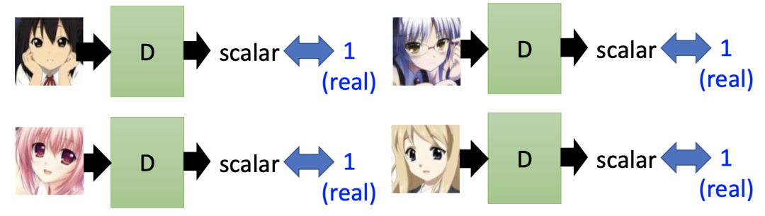 假设我们有一组动漫人物头像,并将其丢入到判别器中,然后判别器输出一个 0 到 1 之间的数值。