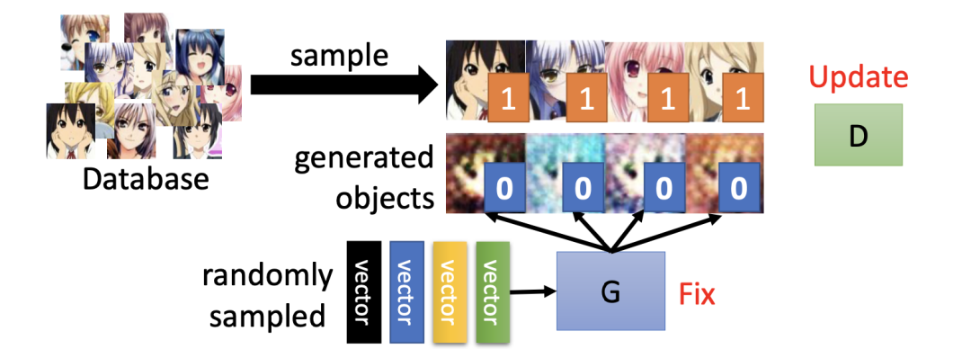 在判别器训练的每一轮迭代中,GAN 会固定生成器 G 的参数,并根据真实图片(标记为 1)和生成器产生的图片(标记为 0)对比,调整判别器 D 里的参数。