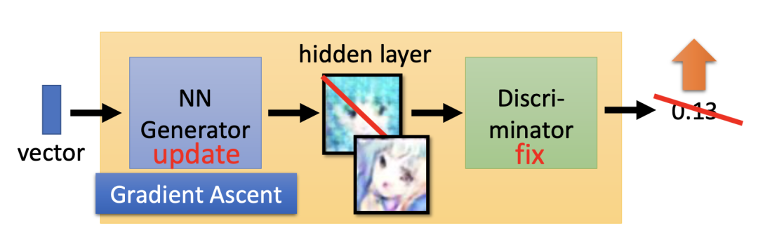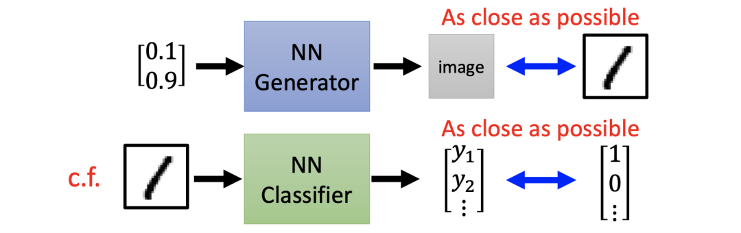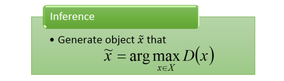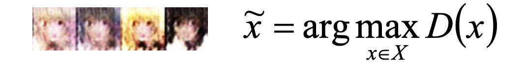 事实上,判别器也能够生成图片,但这一过程非常麻烦。假如说,我门已经有了一个判别器,它能够鉴别一个图片的好坏。我们要做的是穷举所有的输入 x,看看判别器给它的分数,并从中找到得分最大的图,这张图就是判别器的生成。