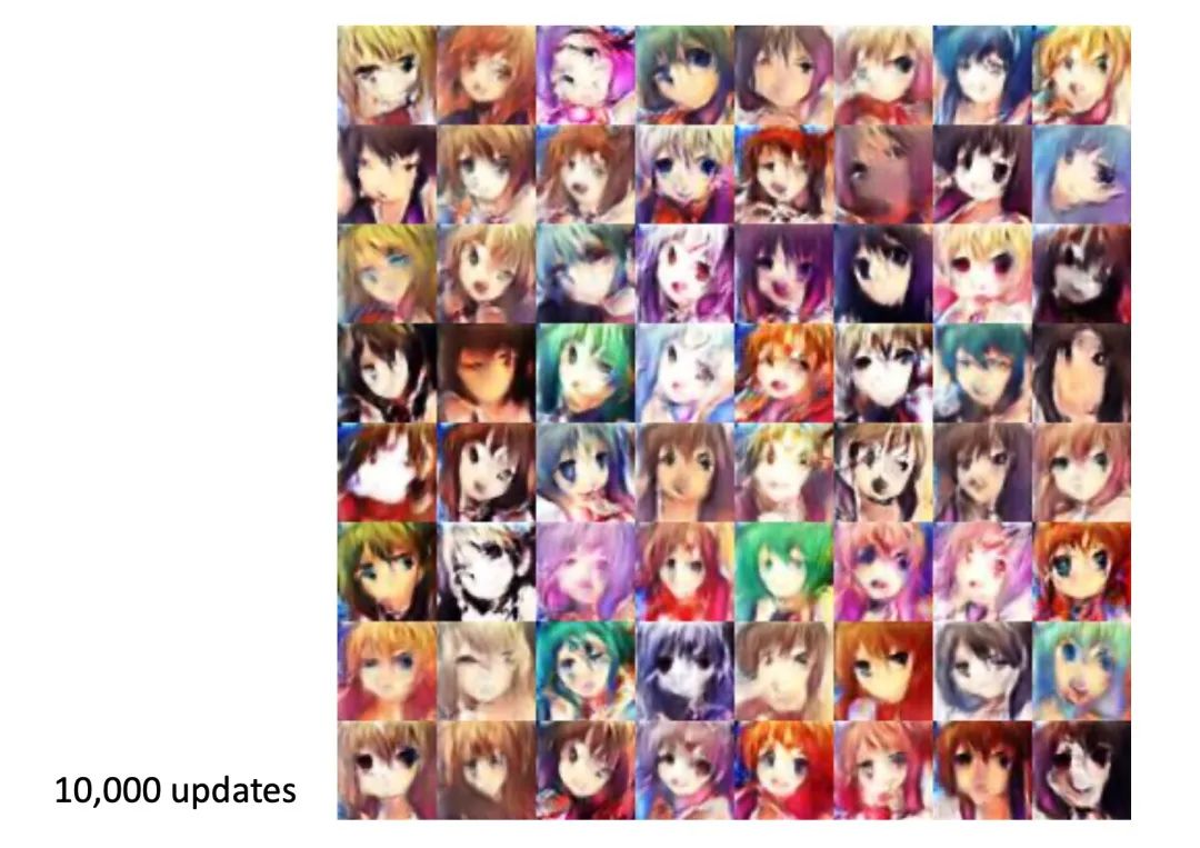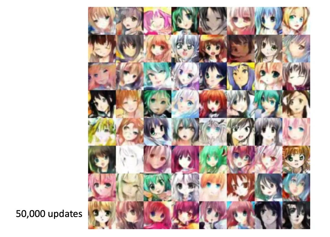 下图给出了不同训练次数生成器生成的效果图,我们可以发现迭代次数越多,生成的图片越逼近真实的动漫图片:
