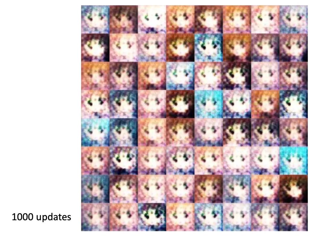 经过反复迭代,最终正样本和负样本就会重合在一起。但生成器最终只会生成完全真实的图片,以至于判别器无法判断输入图片的好坏(类似于过拟合)。