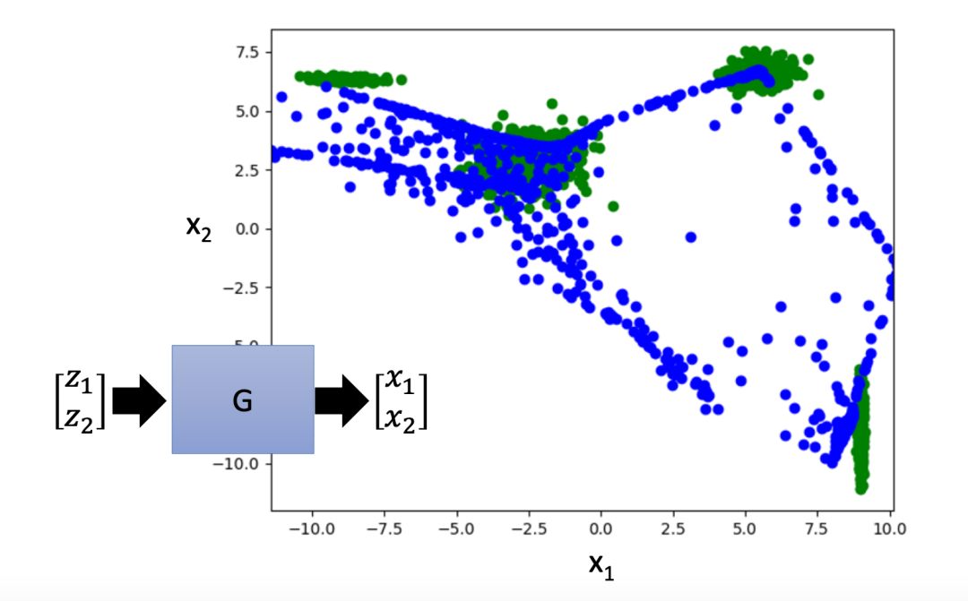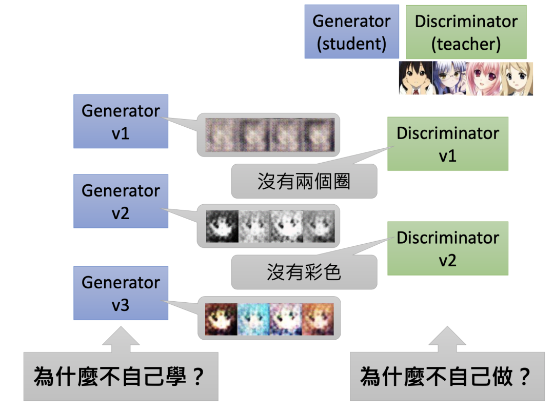 以上这个例子仅仅说明生成网络和判别网络能够互利共赢,但还没有说明两着缺一不可呦!就像好学生完全可以自学成才,好老师也可以圈地自萌一样。很可惜的是,生成网络和判别网络的关系并不完全像师生关系,因为它们有着各自无法忽视的缺点。为此,这里引用李(wo)宏(de)毅(sheng)老(huo)师(jing)的(li)一个例子。