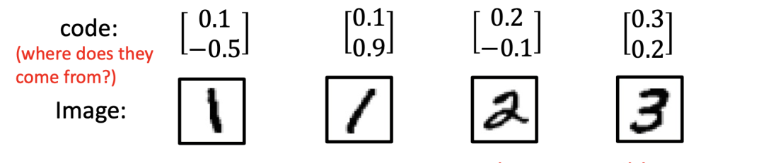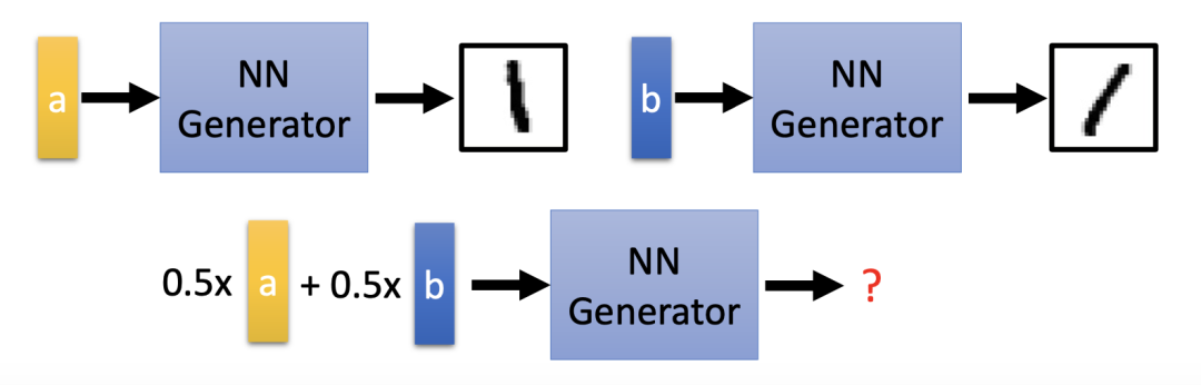 至此我们解决了输入编码问题,但我们将面临一个新的问题:训练数据集里面的图片数量是有限的,假设生成器在看到 a 的情况下会生成偏左的数字图片 1,而在看到 b 的情况下又会生成偏右的数字图片 1,那当输入 a 和 b 的平均值时,生成器会产生怎样的图片?