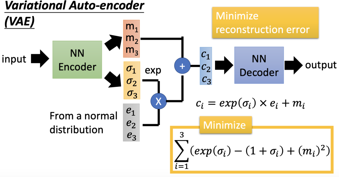 为了解决上述问题,我们改进自动编码器得到变分自动编码器(Variational Auto-Encoder,VAE)。VAE 在输出一个编码(m1, m2, m3)的同时还会产生每一个维度的方差(𝜎1, 𝜎2, 𝜎3),然后再将方差和正态分布中抽取的噪声进行相乘,最后与输出的编码叠加得到(c1, c2, c3),这就相当于加上噪声的编码。我们将(c1, c2, c3)送入译码器中就可以得到输出图片。