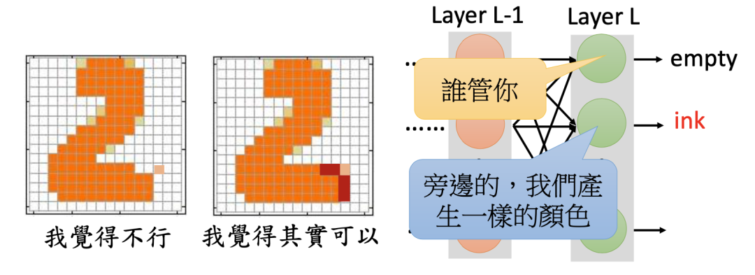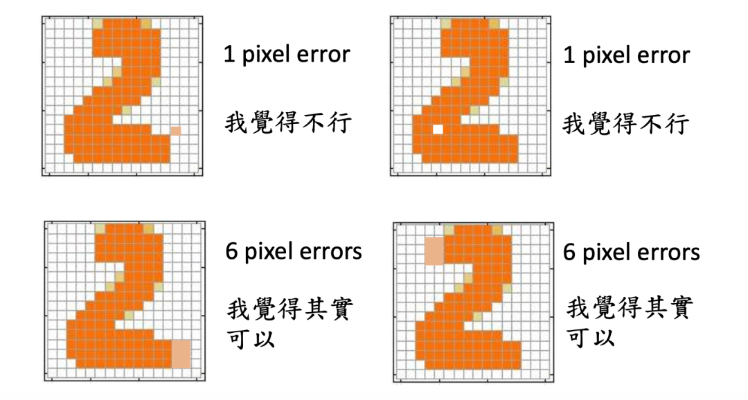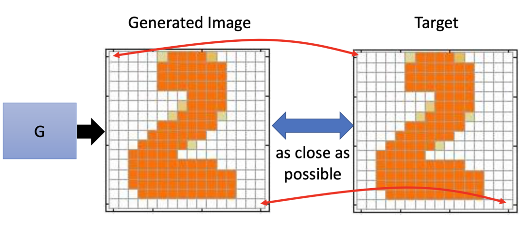 我们在生成器训练的时候,往往希望生成器最终生成的图片和我们给定的图片在像素级别上越像越好。但实际上,生成器的输出图片是肯定会产生一些错误。我们以生成数字图片 2 为例:
