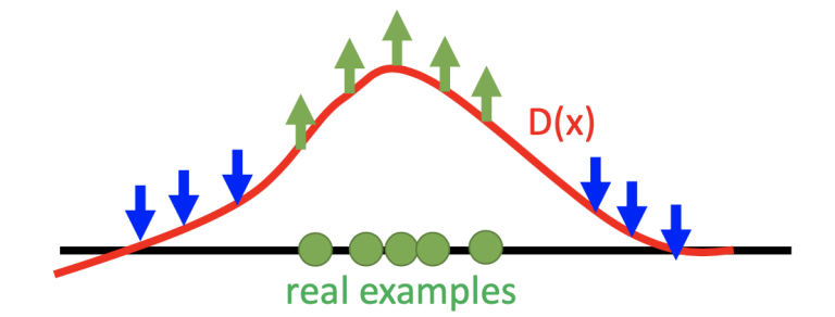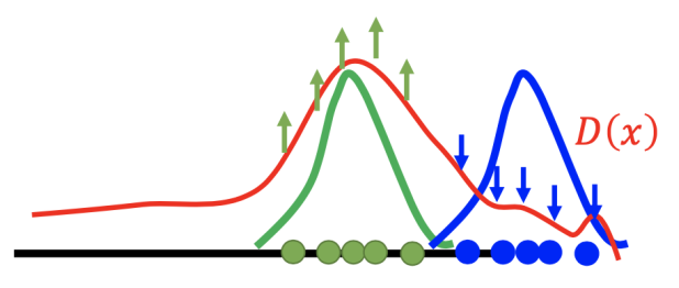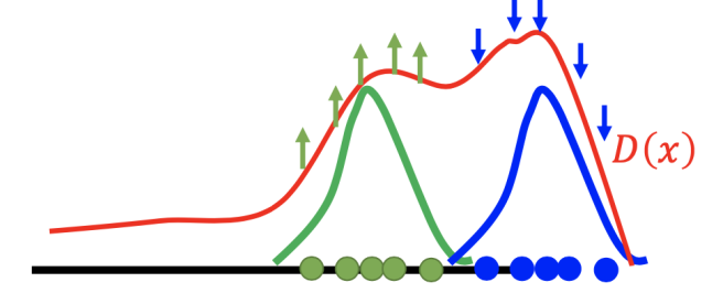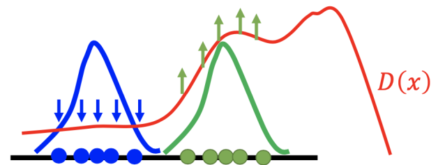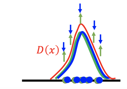 我们需要做的是让判别器给绿色的点高分,而给蓝色的点低分(如果只训练一次的话,可能有些地方的评数比真实样例对应的评数还高)。