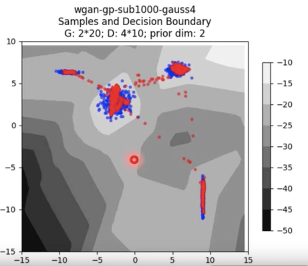 下一步,我们再去寻找出判别器的弱点,即找到那些让非真实样例区域得分最大(如上图右边区域)的样例,并把它们作为负样例。
