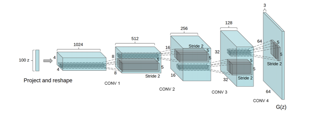生成网络使用一个特殊的深度卷积网络来实现。如下所示,使用微步卷积来生成 64 × 64 大小的图像。第一 层是全连接层,输入是从均匀分布中随机采样的 100 维向量 𝒛,输出是 4 × 4 × 1024的向量,重塑为 4 × 4 × 1024 的张量。然后是四层的微步卷积,没有汇聚层。