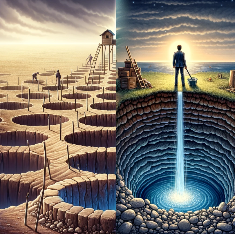 这个就是咱们之前反复提及的“挖多口浅井”、“挖一口深井”的区别。时间相同,付出辛苦也相同,但只有后者能打到水,如下图右半部分。